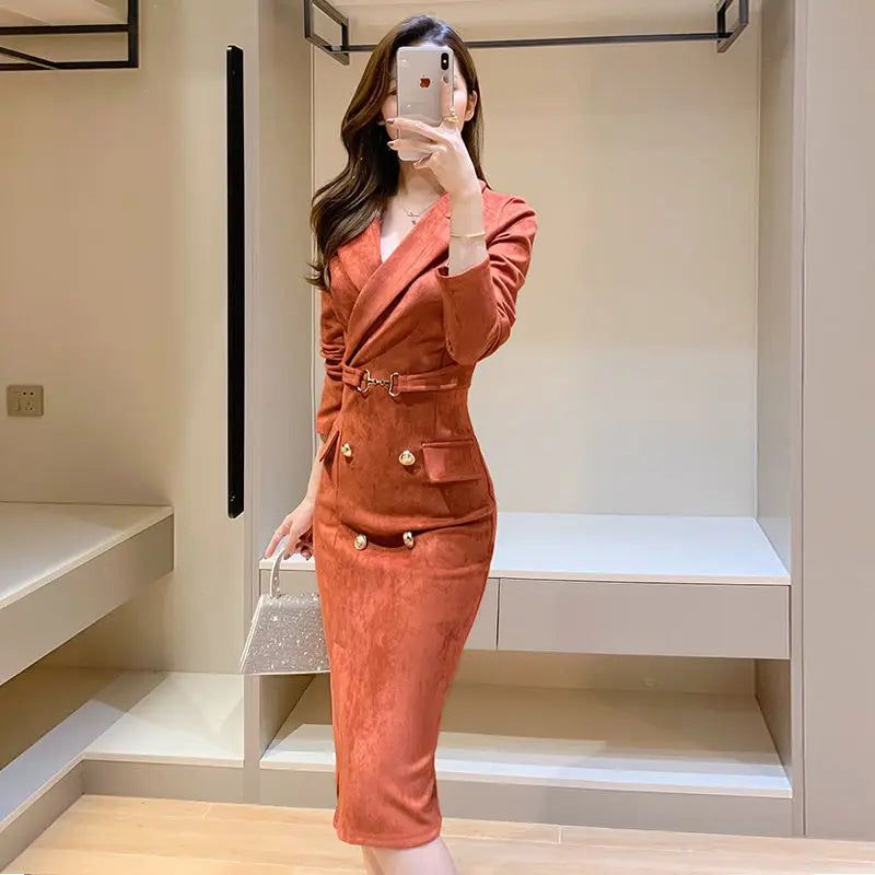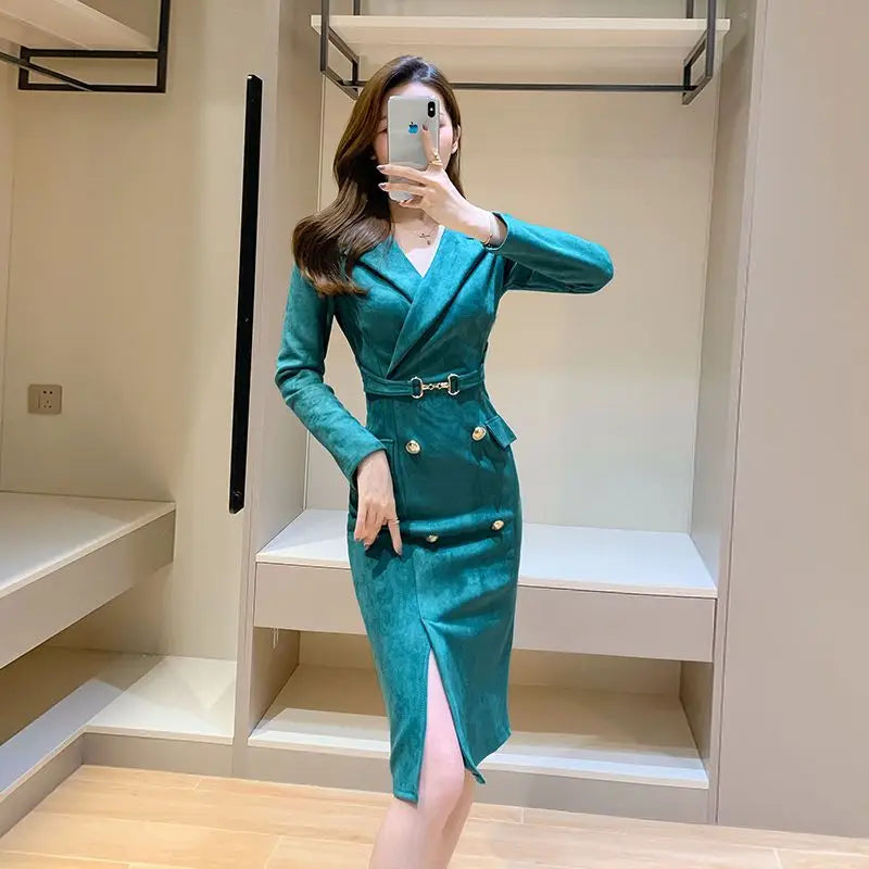 Spring New Luxury Women's Formal Dress Office Lady Solid Color Elegant Notched Long Sleeved Slim Split Midi Party Vestidos 072B