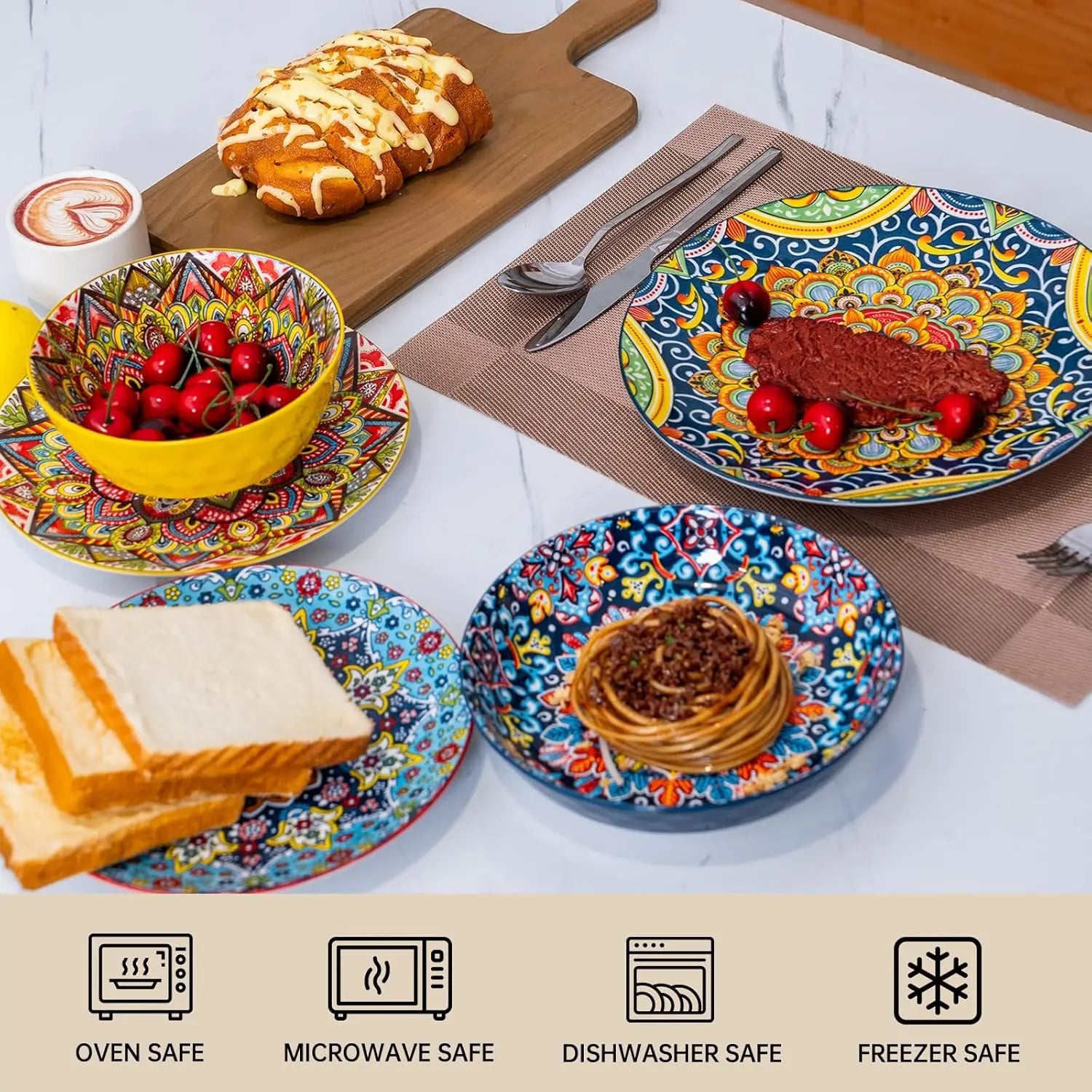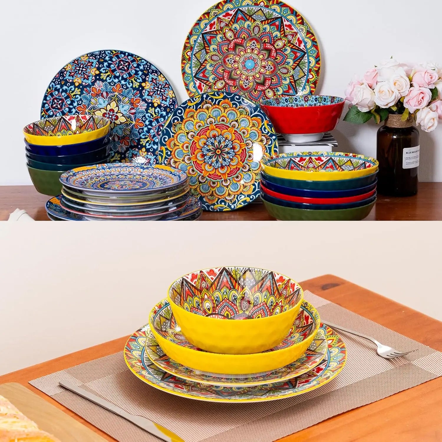 Dinner Plates set of 6, 24 Pieces Dinnerware Sets Microwave and Dishwasher Safe, Scratch Resistant, Bohemian Style Plates and Bo