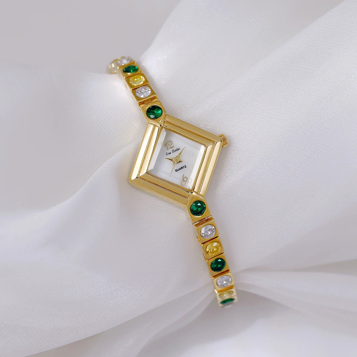 Shine with subtle glamour â this elegant green rhinestone bracelet watch pairs a unique irregular rhombus design with reliable quartz movement for everyday wear or special occasions.