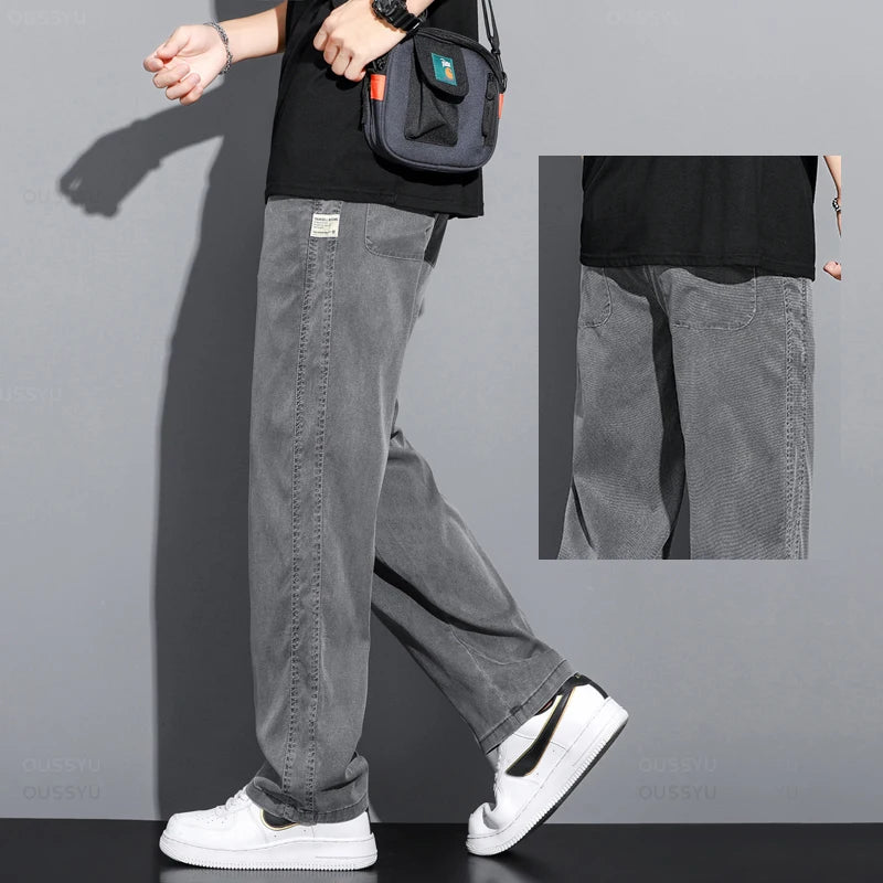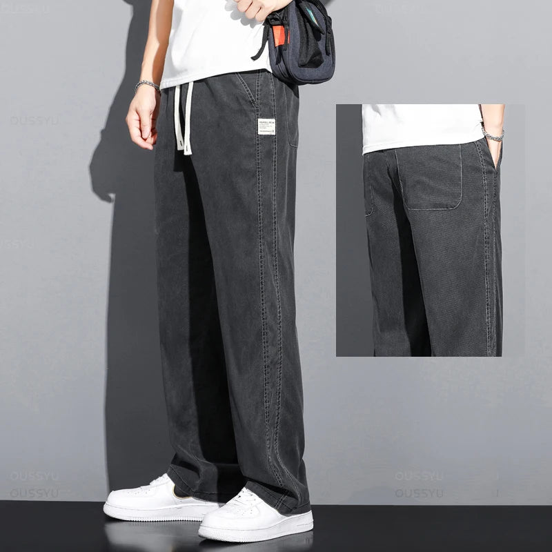 Summer Soft Lyocell Fabric Men's Jeans Thin Loose Straight Pants Drawstring Elastic Waist Korea Casual Trousers Plus Size M-5XL