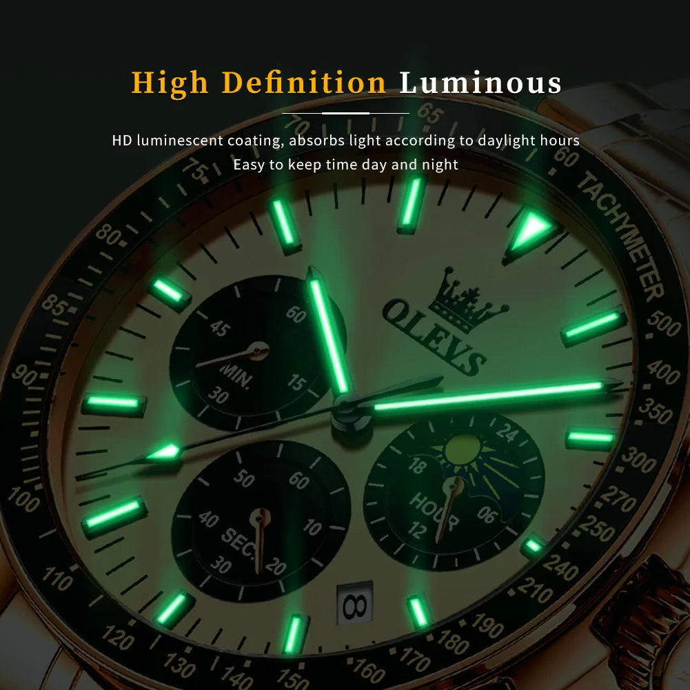 Feature: Chronograph,Complete Calendar,Moon Phase,Water-Resistance,Luminous Hands