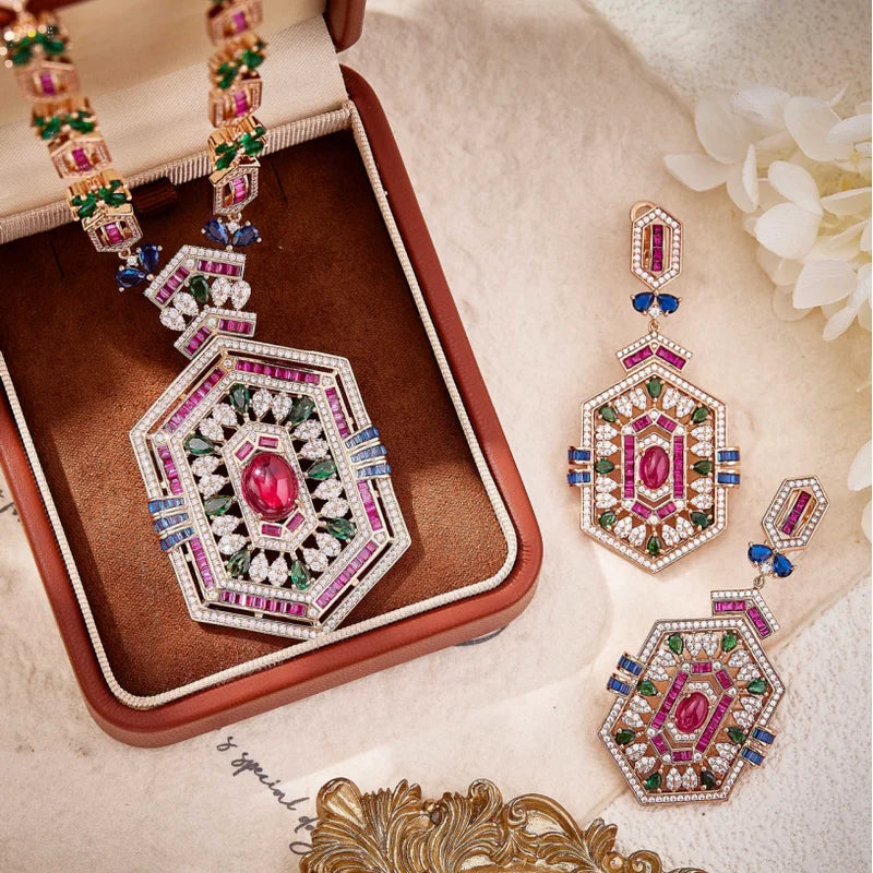 ❤️ Unleash your inner glow with the Zircon & Ruby Rhombus Necklace — where bold beauty meets timeless elegance.