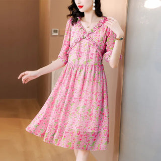 Romantic French Style Pink V-Neck Dress Women's A- Line Mini Dress Slimming Gentle Summer New Arrival Polyester Fiber