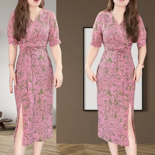 Elegant Floral Print Holiday Dress Summer New Women's V-Neck Short Sleeved Lace Up Slit Dress Luxury Celebrity Party Dress 924P