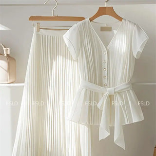 White Chiffon Women's Set Soft A-Line Pleated Long Skirt Short Sleeve Blouse Belt Single Breasted Shirts Suit 2 Piece Sets