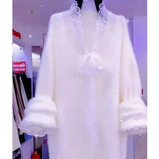 Elegant Lace Patchwork Dress Autumn Winter Warm Mink Cashmere Sweater Dresses Office Women V-Neck Lace Up Midi Vestidos 699B