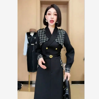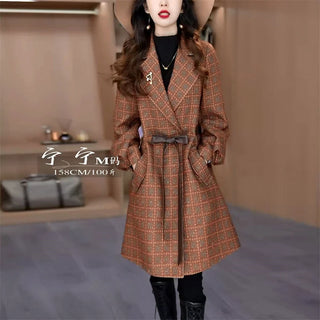 Women's Plaid Woolen Coat Fall Winter New Elegant Office Lady Notched Collar Lace-Up Jacket Fashion Bright Silk Outerwears 600P
