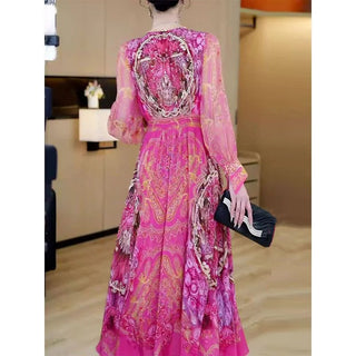 Vintage Print Women Holiday Dress Elegant Beading V-Neck Long Sleeve Slim High Waist Midi Dress Female Summer Robe Clothing J099