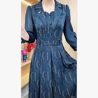 Korean Luxury Letter Printing Party Dress Autumn Elegant Women Notched Collar Puff Sleeve High Waist A-Line Midi Vestidos 912P