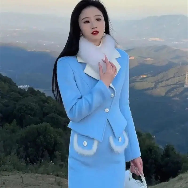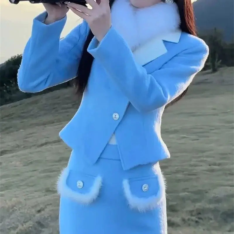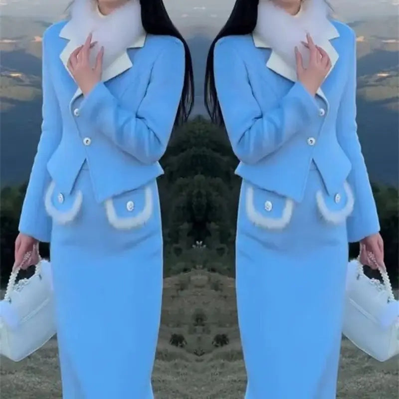 Autumn New Temperament Fur Patchwork Suit Elegant Pearl Buttons Women Jacket+High Waist Midi Skirt Celebrity Party Outfits 948P