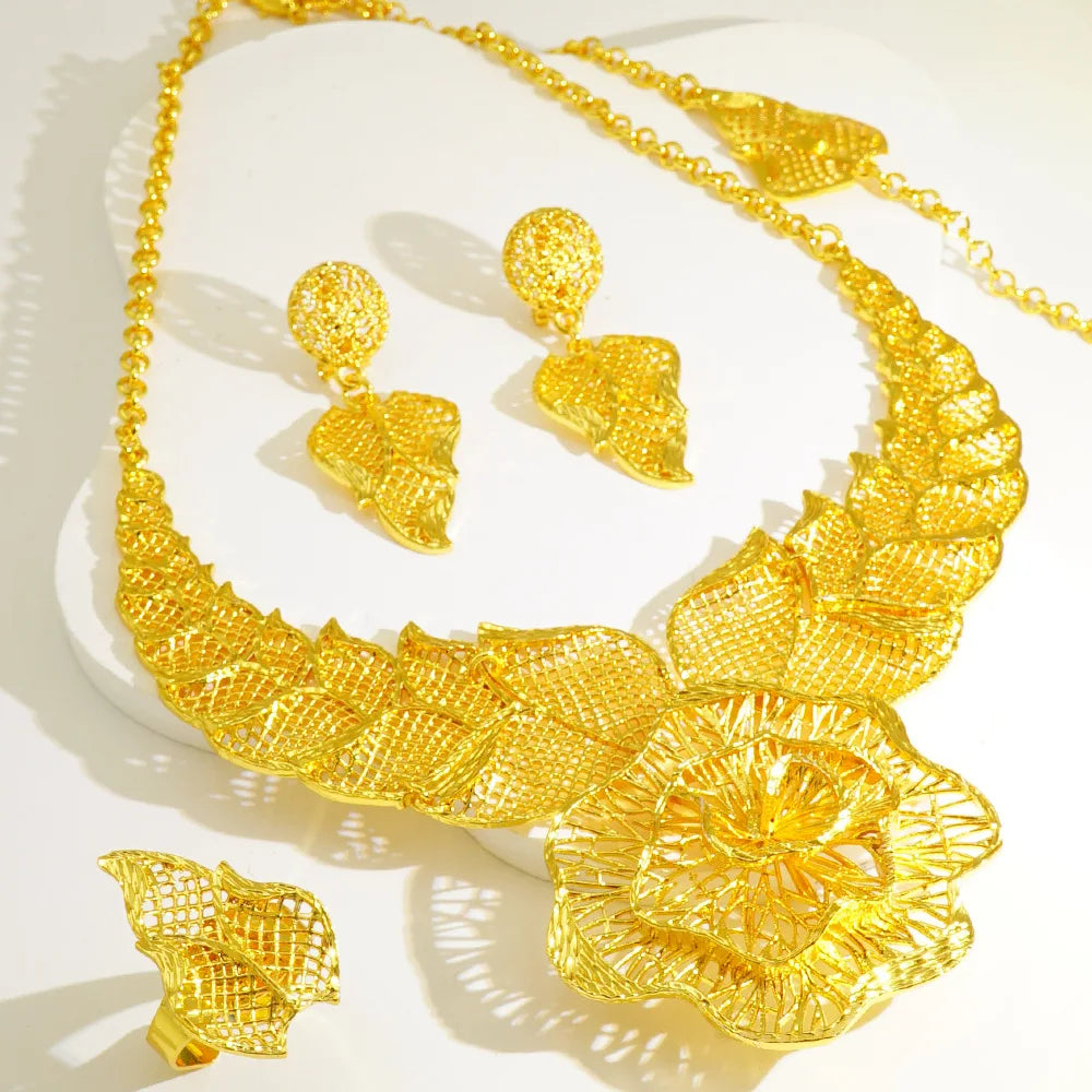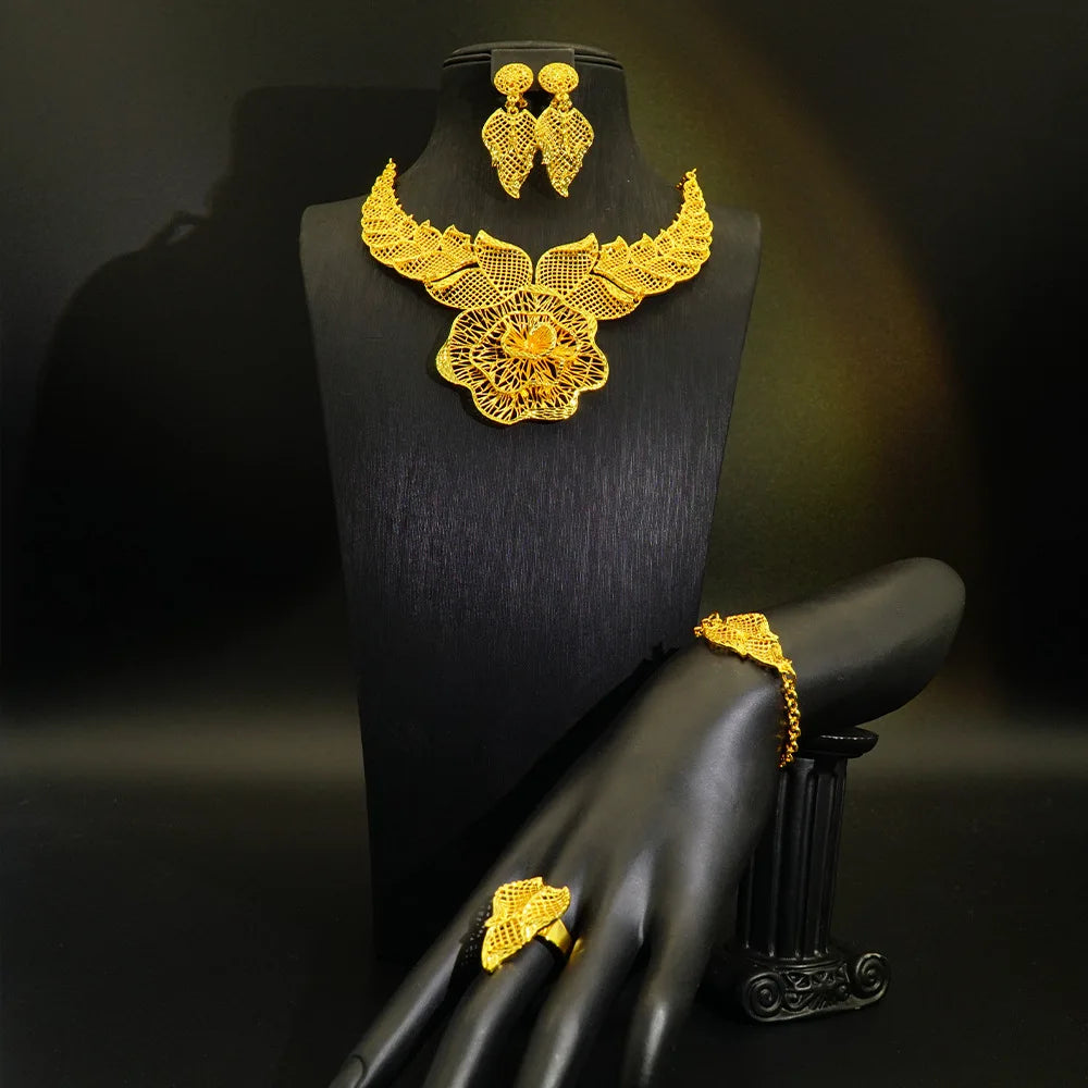 Women's 24K Gold Flower Grass Hollow Jewelry Set (4pcs), AU999 Floral filigree design with "Lush" engraving & hidden vine motif